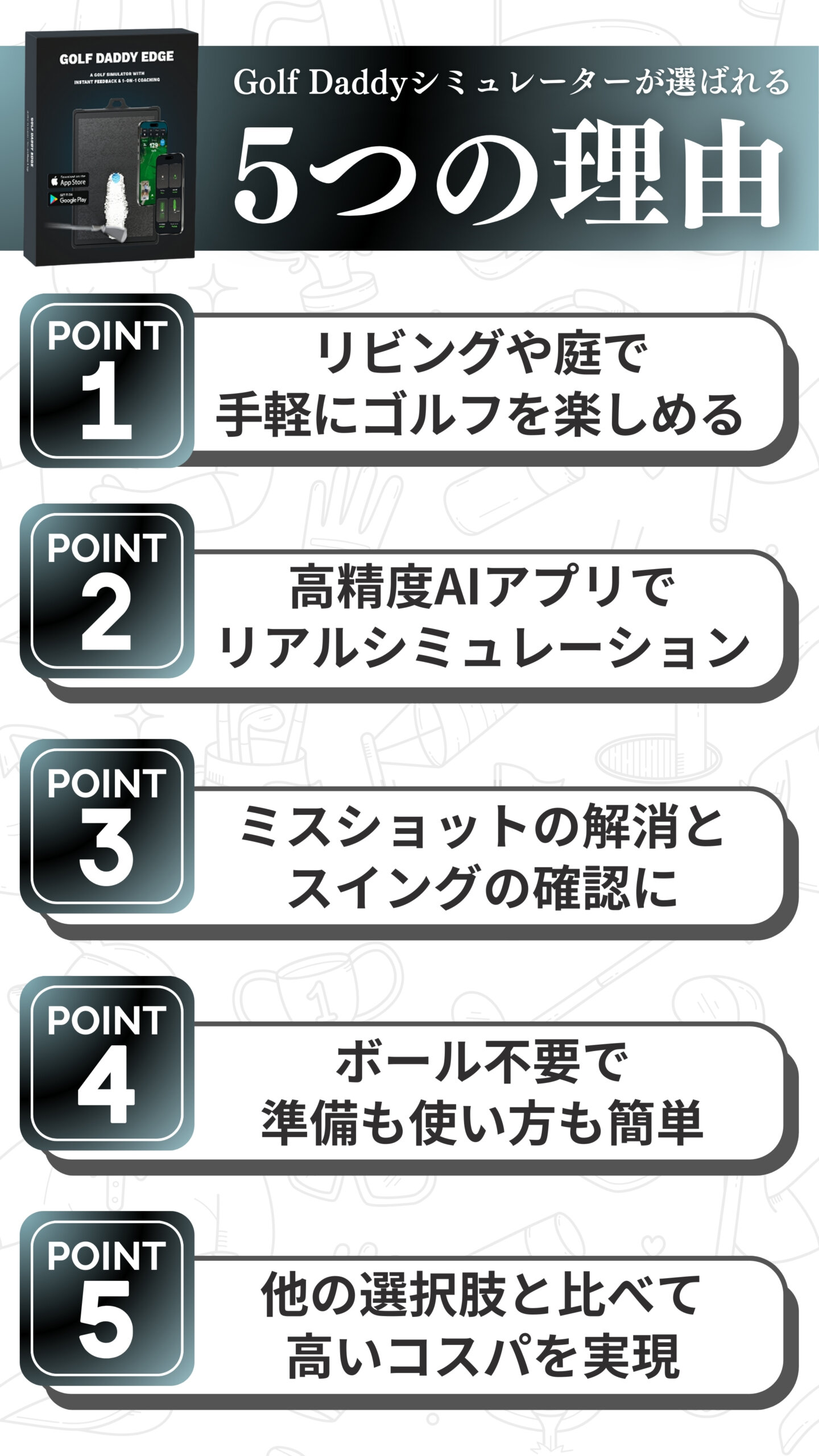 ※公式アプリ「Golf Daddy : Golf at home」はApp StoreもしくはGoogle Play Storeからダウンロードが可能です。シミュレーターをお使いいただく前にスマートフォンへダウンロードとインストールをお願いいたします。