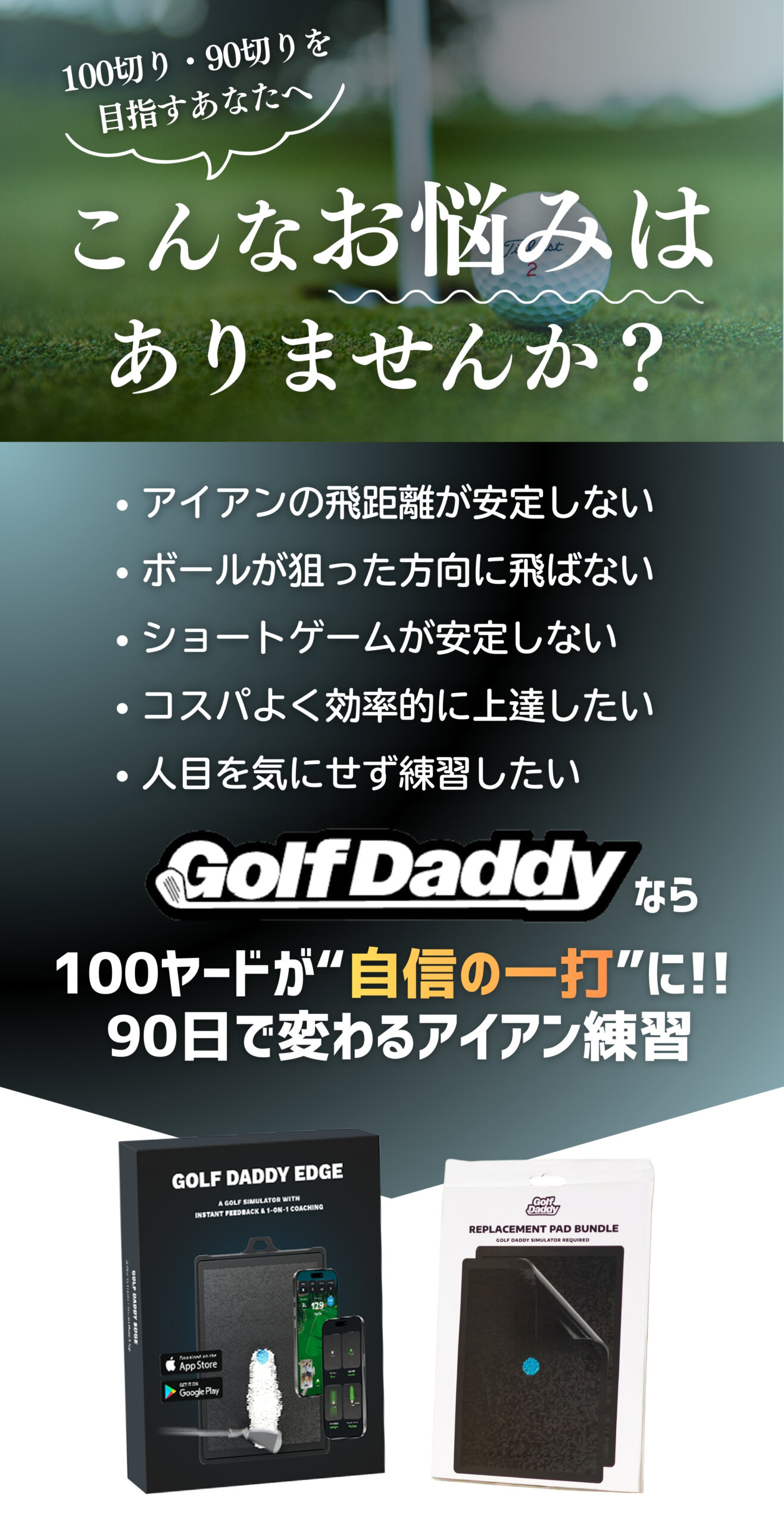 ご存知かと思いますが、「ショートゲームの安定がスコアに直結する」と言われています。まさにGolf Daddyはそこに特化しており、スコアメイクに重要な練習をひたすら積むことができて着実に上達する練習器具なのです。